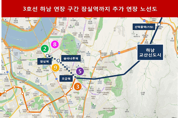 현재 3호선은 서울 오금역까지 운행 중이죠. 그런데 이번 사업을 통해 3호선이 하남시청역까지 이어집니다. 총 연장 구간은 11.7km, 정거장은 총 6곳이 새로 들어서게 됩니다.