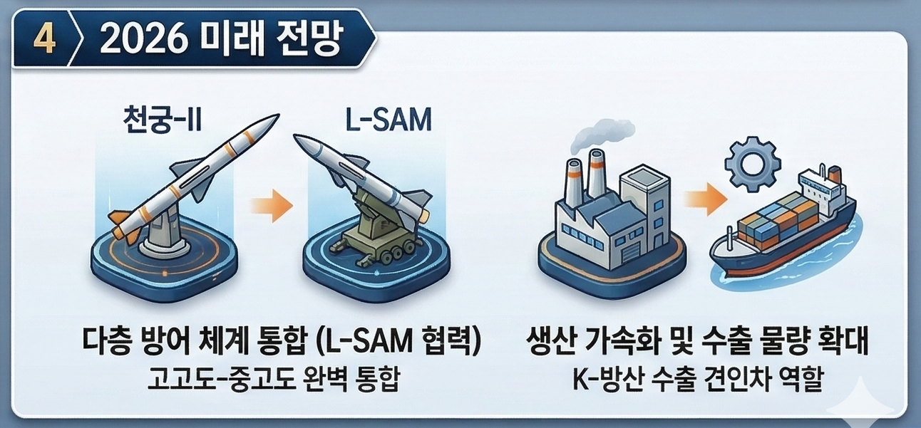 천궁-II는 현재 한국형 미사일 방어체계(KAMD)에서 고도 40km 이하 '종말단계 하층 방어'를 담당하고 있어요. 여기에 국방과학연구소가 개발 완료한 장거리 지대공 유도무기 L-SAM이 양산 및 실전 배치 단계에 접어들면서, 40~70km 고도의 '종말단계 상층 방어'까지 커버할 수 있는 다층 방어망이 완성됩니다. 천궁-II가 중간을 막고 L-SAM이 더 높은 고도를 맡는 구조로, 탄도미사일이 뚫고 들어올 빈틈이 크게 줄어드는 거예요.